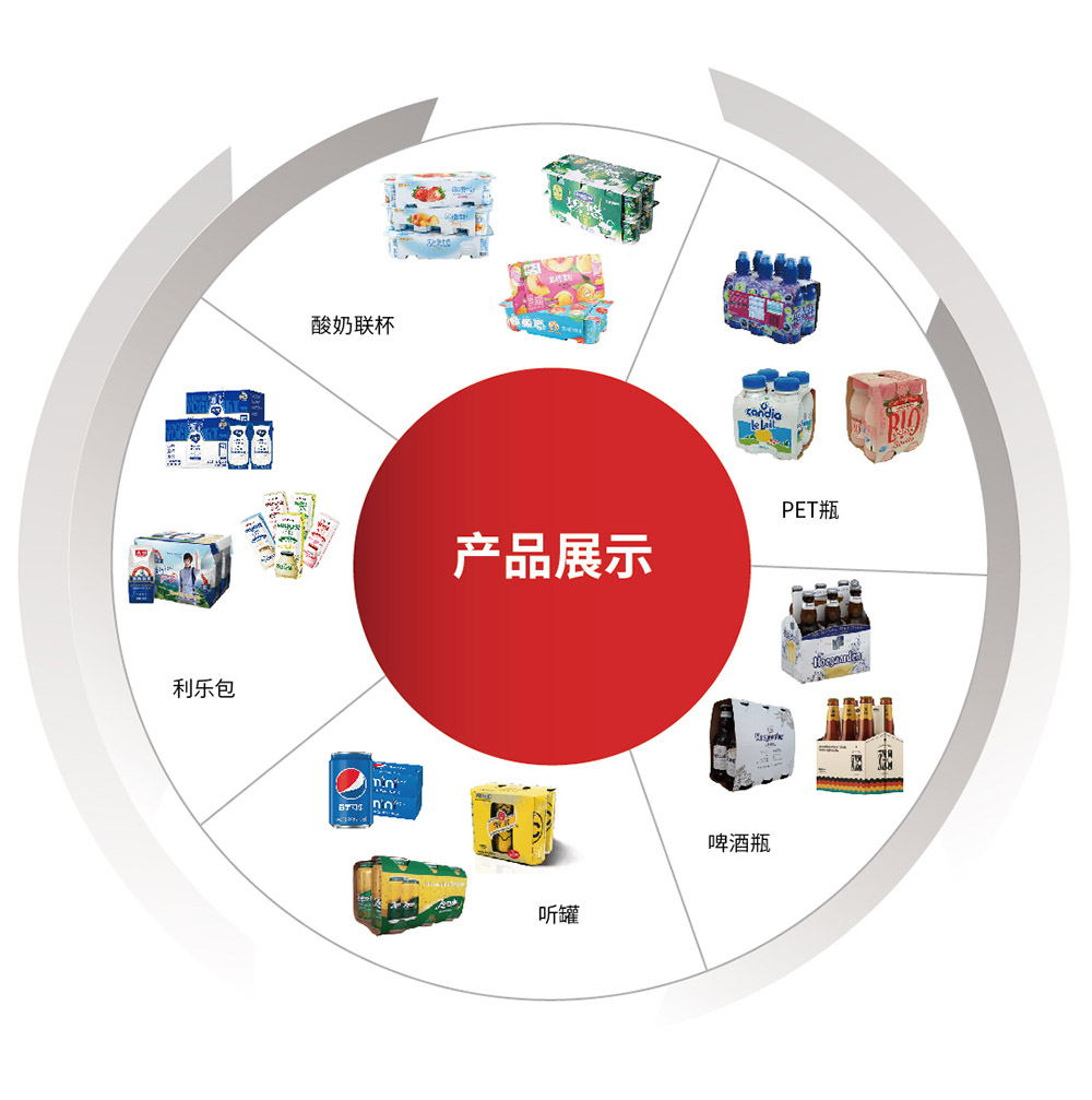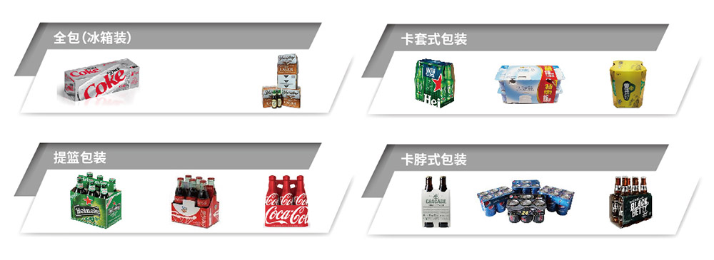 集束(合)包装机适合包装产品:如酸奶杯、听罐啤酒饮料、玻璃瓶,PET瓶及托盘集合装等。将成型纸板套在单个或多个规则物体上。